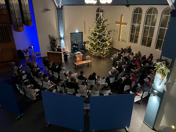 Dit jaar kwam een klein groepje jonge gemeenteleden met het plan om op 24 december een dienst te organiseren. In betrekkelijk weinig tijd is het ze gelukt om een warme (niet letterlijk) dienst te maken waarin we mooie liederen zongen, begeleid door piano, gitaar en fluit. Er werd een kerstverhaal gelezen en de zaal was speels versierd omdat vele bezoekers een kaarsje in windlicht hadden meegenomen. Op de foto zie je een speelse opstelling rondom de mooie kerstboom. Mede hierdoor werd het een intieme bijeenkomst. Doordat er flyers waren verspreid wisten heel wat dorpsgenoten ons te vinden.